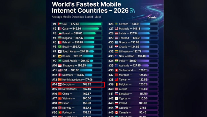 2026 წლის მონაცემებით, მობილური ინტერნეტის სისწრაფის მიხედვით ქვეყნების ჩამონათვალი გამოქვეყნდა. პირველ ადგილს არაბთა გაერთიანებული საამიროები იკავებს.